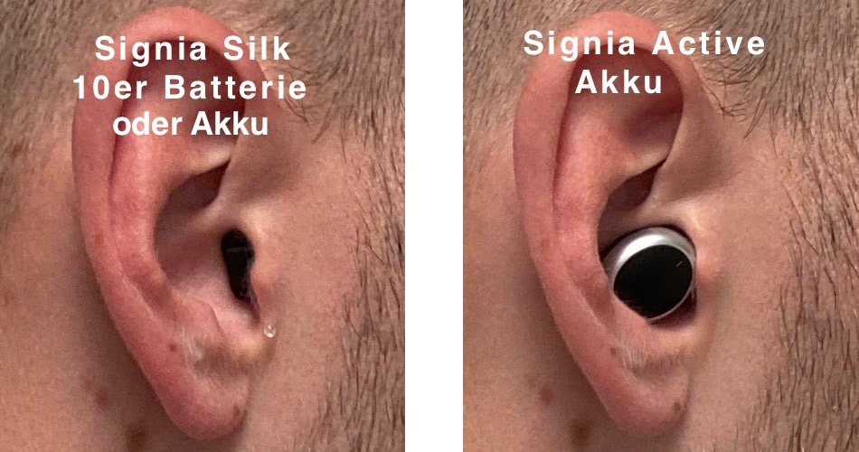 Im unteren Bild haben wir links ein sehr kleines Im Ohr Gerät, das mit einer Batterien betrieben wird im Vergleich zu dem Signia Active, das einen Akku hat dargestellt.